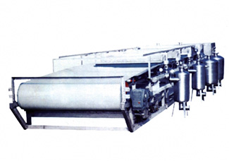 直到真空濾盤碰到接近開關(guān)裝置并切斷真空,此時真空濾盤在氣缸的拖動下迅速返回到原始位置,濾帶在電機的拖動下繼續(xù)運行,這樣周而復(fù)始進行真空抽池、洗滌、再抽濾,濾餅在卸料輥處被刮刀裝置刮離卸除,濾布經(jīng)清洗后獲得再生,再經(jīng)過一組支承輥和糾偏裝置里新進入過濾區(qū)。濾液在集液罐中隨著濾盤返回時排出。